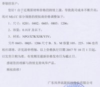 自2016年第三季度至今,被动元件价格持续上涨,至今已经有过几轮,风华电容近日又再一次向各代理商下方了统一涨价通知,最新价格生效时间为2017年10月1日。产品主要涉及 MLCC 和 R...