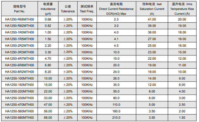 HA1250系列功率电感涵盖多种电感量规格,从0.68μH到68.00μH,公差均为±20%,测试频率统一为100KHz,便于不同型号间的性能对比。以下是该系列型号的技术参数表: