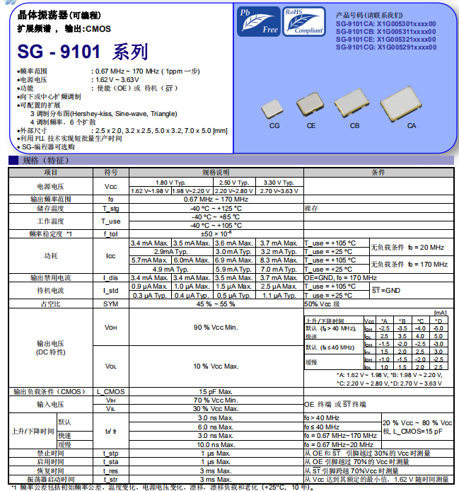 大家好,今天给大家介绍扩展频率中的SG-9101CESG-9101CE是一款小尺寸3225。随着市场小型化、多功能、高信赖度的电子产品需求量大增,产品开发周期时间要求越来越短,传统的石英晶振性能优异,但设计制造周期相对较长,如果有工程师因为项目急需特殊频点,特殊封装的晶振产品用于设计测试,很有可能无法短期内获得对应频点的样品而可能耽误设计周期,影响项目交付进度。扩展频率晶振的出现极大的解决了工程师对新产品晶振的实时变更需求。SG-9101CE内置一个高稳定的有源晶振(基频),利用PLL技术,配合对应的工具软件及外置的编程器方便的调整分频/倍频参数,并在线烧录,几分钟就定制成一个客户所需的全新晶振。这样就大大节省了客户的等待时间,实时提供样片供用户测试。另外对于用量相对较小的用户,可以采取这种方式批量生产,极速交付。SG-9101系列可以分为: SG-9101CA 7050  SG-9101CB 5032 SG-9101CE 3225 SG-9101CG 2520 ,而其中SG-9101CE是小尺寸3225有源晶振同时也是销量很高的一款扩展频率晶振。SG-9101CE频率可编程范围0.67MHz~170MHz(每步1ppm),扩展频率范围±0.25%~±4%。SG-9101CE新品提供更宽广的操作温度范围,及降低50%的消耗电流。SG-9101CE扩展频率晶振的消耗电流比现行量产品更大幅降低了75%。SG-9101CE的扩展频率晶振提供几种类型的调制方式,可以实现б值为±0.5%、±0.75%、±1%、±1.5%、±2%和0.25%的调制,实践证明引入扩展频率晶振调制引入的时钟信号抖动很小。SG-9101CE通过动态改变时钟频率,有效降低d电磁辐射功率,减少EMI电磁干扰的影响,球信网集团电子依然给大家提供SG-9101CE规格书以供大家选型参考: