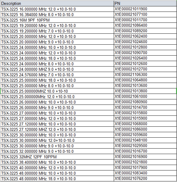 今天给大家介绍适用于便携式无线传输设备的3225无源那么就不得不提下TSX-3225ESPON的TSX-3225产品已经非常成熟,已经在各个产品各种应用环境中都有成熟的应用,业内人都知道,虽然爱普生已经开发出2520甚至更小尺寸2016无源晶振,但是尺寸更小,也代表着制造工艺越发繁琐成本的增高,现在很多便携式产品需要尺寸小,高性能,寿命长,价格适中的,3225已经相对而言属于小尺寸晶振,可以满足便携式设备的要求,价格也比2520,2016要低,厉害的是,TSX-3225无源晶振的成本比5032的也低,所以说TSX-3225是性价比较高的的选择。TSX-3225常用的型号中TSX-3225 24MHz 12PF±10PPMTSX-3225 16MHz 12PF 10PPM都是比较常用的两颗料工作温度:-40℃ ~ +85℃。TSX-3225系列无源晶振是一款应用比较广泛的爱普生无源晶振。因为其频率范围覆盖16MHz~48MHz。可以用于移动电话,蓝牙,无线-局域网,ISM 频段电台广播,MPU时钟等领域。下面球信网集团电子就把TSX-3225的常用的标准频率表分享给大家